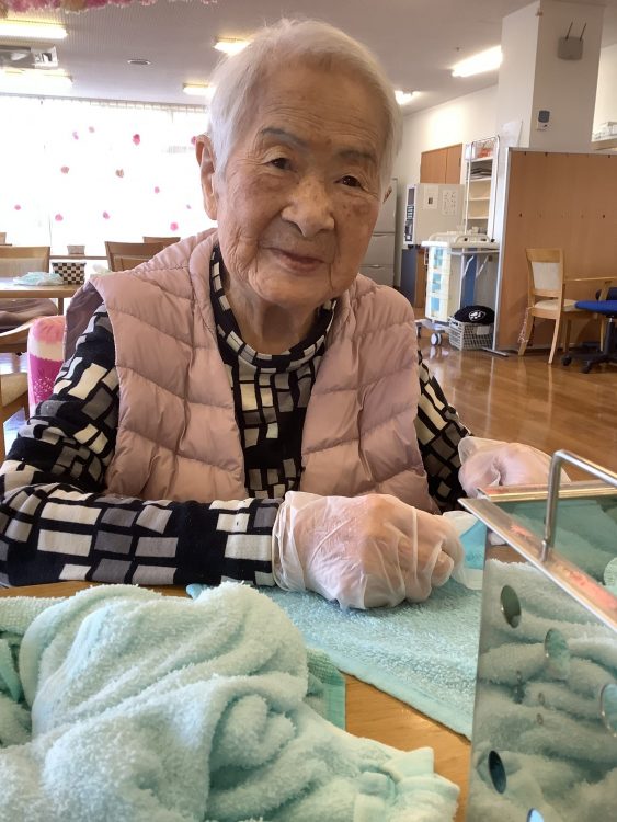 おしぼりを畳みながら「これ私がたたんだやつ、働けことは花だよ」と