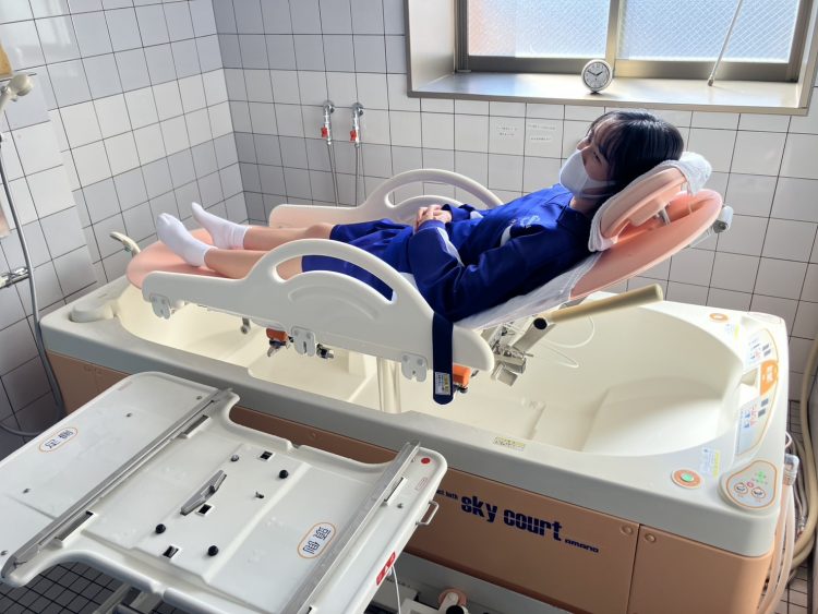 利用者様が日常で使われている車イスや機械浴の操作法、実際に体験して頂きました。