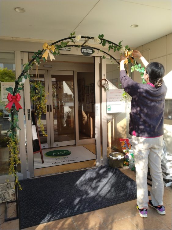 ずっとひまわりのままだった入口のアーチを、クリスマスらしく模様替え🎀