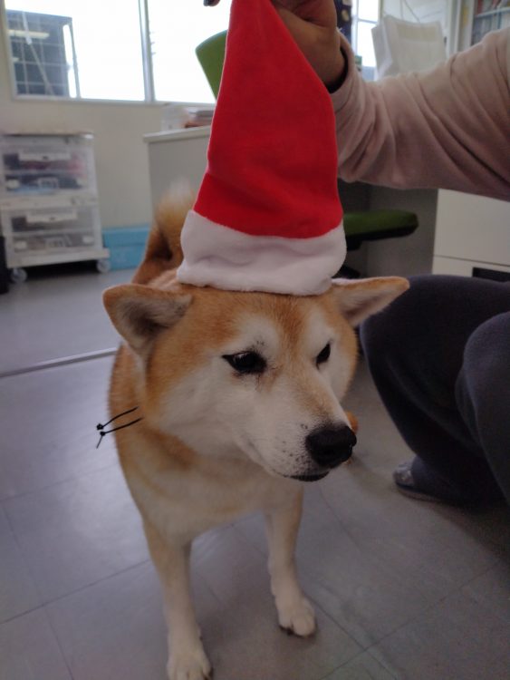 新しく買ってもらったサンタクロースの帽子を被って