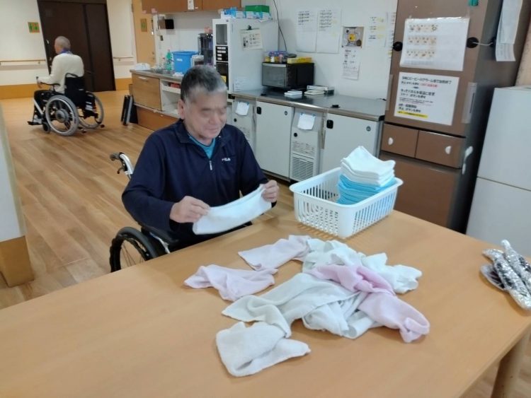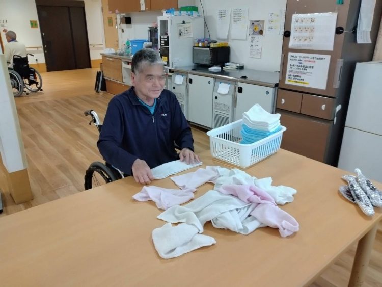 Ⅰ号棟のホールでF様がタオルをたたんでくださっていました✨
