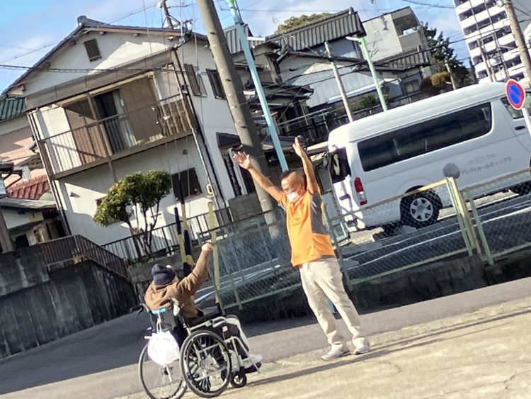 外へ出て体操するスタッフと、利用者様✨