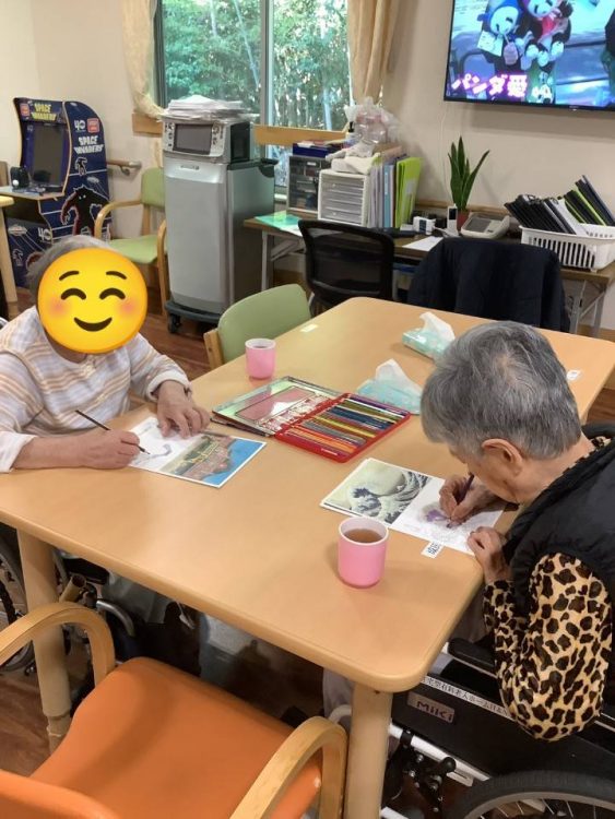 先日、Ⅲ号棟にお邪魔するとお二人ともぬり絵に夢中!